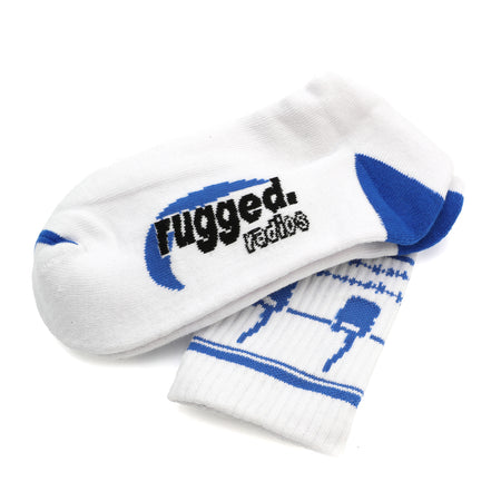 With a classic white base, bold blue accents, and the Rugged Radios logo, they deliver the perfect blend of style and performance. Engineered for durability and all-day wear, these socks are as tough as your adventures.